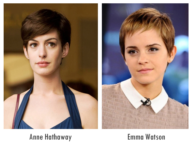 Referensi gaya rambut pendek untuk si wajah oval adalah Pixie Haircut milik Anne Hathaway dan Emma Watson.